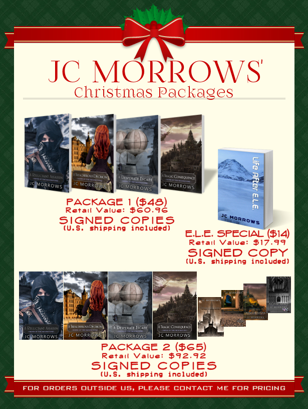 Package 1) 1 Paperback copy each of “A Reluctant Assassin”, “A Treacherous Decision”, “A Desperate Escape” & “A Tragic Consequence” (personalized if you wish) – accompanied by a Christmas card and a selection of bookmarks.