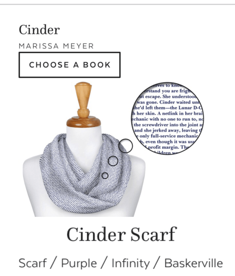 I personally have wanted one of these for… well, since I first discovered them! And, while I would LOVE to have one with the words from A Reluctant Assassin or [even more fitting] Life After E.L.E., neither of them are on the extensive list already on the Litographs site, so I would happily settle for a scarf with Cinder on it!!! #fangirling HARD!